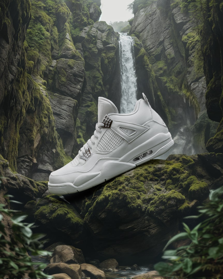 "화이트 스튜디오", "야외 자갈 바닥", "봄 캠페인" 텍스트 한 줄, 이미지 한 장으로 배경을 교체하세요.